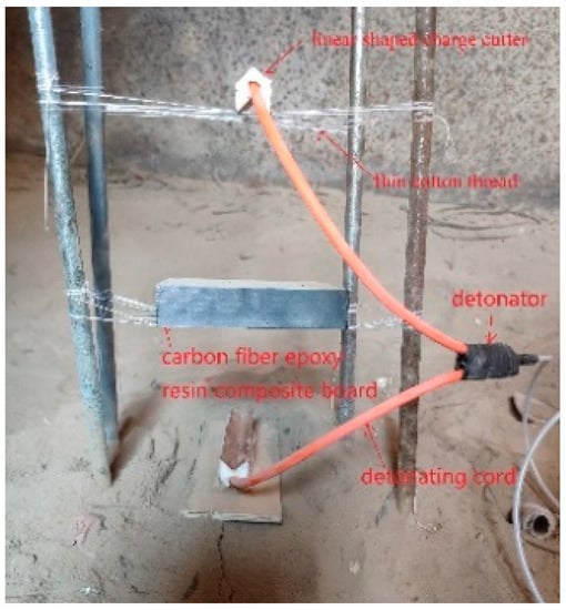 The principle of linear shaped jet cutting is that after the charge desensitized RDX in the cutter was detonated, the product of explosion and shock wave squeeze the V-shaped explosive cover and push it to form a jet that rushes to the laminate and cuts it off. The schematic is shown in Figure 2. The shell of the cutter and the V-shaped explosive cover were made from 1 mm thick copper. The shell and explosive cover were attached with glue. The internal charge was desensitized RDX, and the port was closed with plasticine. The two cutters were fixed symmetrically on the front and back of the composite board and exploded by detonating cord, as shown in Figure 3.