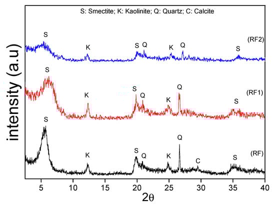 X-ray diffractograms obtained from the RF, RF1, and RF2 clays.