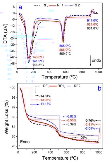 Figure 2a,b shows the DTA and TG curves of the RF, RF1, and RF2 clays. Figure 2a shows the DTA curves; in general, the curves show three thermal events. The first thermal event has an endothermic nature, and the peak maximum temperatures were 146.8 °C, 143.8 °C, and 141.8 °C for the RF, RF1 and RF2 clays, respectively. This first event is related to the evaporation of water (free, adsorbed, and coordinated) [64]. Still, on the first thermal event, we can see a shoulder (more evident in the RF clay, 200 °C to 280 °C), which is often associated with polycationic bentonite with more than one exchangeable cation, such as calcium and magnesium, [65]. The second event was endothermic as well and is related to the partial dehydroxylation of the octahedral sheet of smectite, and the peak maximum temperatures were 569.9 °C, 565.0 °C and 565.9 °C for the RF, RF1 e RF2 clays, respectively. The third thermal event was exothermic and is related to mullite nucleation [66], and the peak maximum temperatures were 930.0 °C, 921.0 °C, and 917.0 °C for the RF, RF1 e RF2 clays, respectively. There were no significant differences in the intensities of the thermal events in Figure 2a. This behavior indicates that acid treatment did not cause expressive destruction in the crystalline reticulate of the clay minerals found in bentonite. However, the acid activation enabled protonation in the structure of the material, creating acid sites and removing impurities with partial destruction of the crystalline reticulate through dehydroxylation of the structural hydroxyl groups present in the octahedral layer of the clay [67,68].