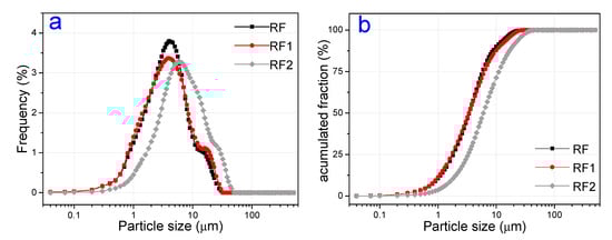 Granulometric compositions and average sizes of particles measured from the RF, RF1, and RF2 samples.