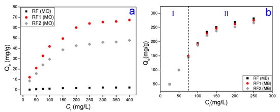 Figure 4a,b shows the adsorbed amount dependency of the MO and MB dyes due to different initial concentrations of the adsorbate. In general, it was noted that the amount adsorbed () of MO and MB increases as the initial concentration increases [43]. At a molecular scale, this behavior occurs because the increase causes more interactions between the clay surface and the dye molecules, implying a rise in the adsorption rate [72]. Additionally, the increased adsorption rate can be explained due to the increase of charge of the adsorbent in terms of the elevated driving force to transfer the existing mass in greater concentrations of dye [73]. In Figure 4a, an increase in can be seen for the clays treated with acid. Indeed, for the MO dye, the acid activation increased the adsorption capacity of the clays in up to 8000%, with increased value of 2.2 mg/g in the RF, for 67.4 mg/g in the RF1 and 47.8 mg/g in the RF2. It is known that the calcium bentonite, such as the other clays, has a negative charge in its surface structure that derives from isomorphic substitutions of the Al3+ for Si4+ ions in the tetrahedral layer, and Mg2+ for Al3+ ions in the octahedral layer [74]. For this reason, the maximal MO adsorption in RF was insufficient due to the electrostatic repulsion between the negative charge in the clay surface and the negative nature of the MO.