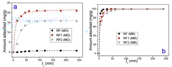 Effect of contact time (tc) on (a) MO adsorption and (b) MB adsorption. The lines are only guides for the eyes.
