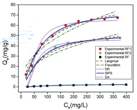 The Sips equation is based on the theory that at low adsorbate concentrations, the adsorption is described by the Freundlich equation. At high adsorbate concentrations, the adsorption is already characterized by the Langmuir equation; that is, it occurs via monolayers [81]. The KS adsorption capacity constant obtained from the Sips equation is in agreement with Figure 6 since acid-functionalized calcium bentonite presented higher KS values (7.7 × 10−4, 2.1 × 10−3, and 1.5 × 10−3 to RF, RF1, and RF2, respectively). On the other hand, the 1/nS values, also acquired from the Sips equation, varied between 0.68 and 0.64. It is known that 1/nS values less than 1, indicating a certain degree of heterogeneity on the surface of the acid-functionalized bentonite [82]. The heterogeneous surface on the acid-functionalized clay occurs because the acid attack disorganizes its structure favoring an increase in the surface area, with consequent formation of mesopores and ions leaching (Ca2+ and Mg2+, in the case of this work) [83,84]. The experimental evidence for the leaching of Ca2+ and Mg2+ ions can be seen from the analysis in Table 1.
