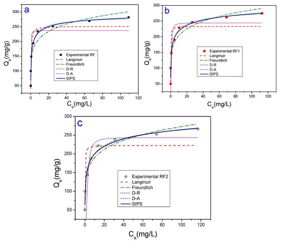 Adsorption isotherms of MB in room temperature conditions, adsorbent mass 100 mg, using in 90 min: (a) adsorbent RF; (b) adsorbent RF1; and (c) adsorbent RF2.