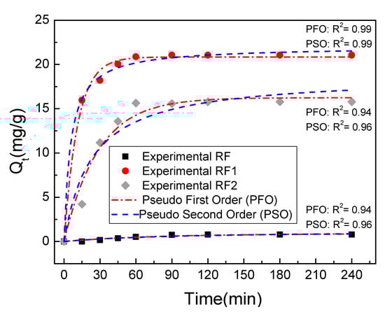 The pseudo-first-order [56] and pseudo-second-order models [57] were used to infer adsorption kinetics between the MB and MO dyes and RF, RF1 and RF2 clays, see Equations (7) and (8):