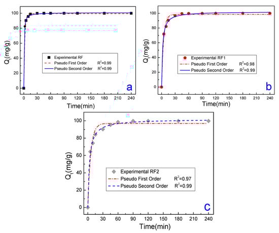 Kinetic graphs of MB in room temperature conditions, adsorbent mass 100 mg, fixating Ci in 50 mg/L: (a) adsorbent RF; (b) adsorbent RF1; and (c) adsorbent RF2.