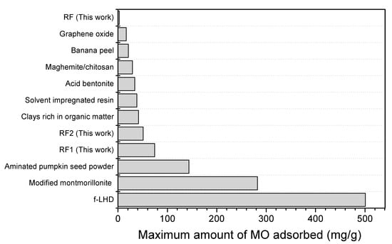 In this regard, Figure 10 compares the of MO obtained in this paper with literary data for graphene oxide [31], acid bentonite [88], solvent impregnated resin [89], clays rich in an organic matter [90], banana peel [91], maghemite/chitosan [92], aminated pumpkin seed powder [93], montmorillonite modified by gemini surfactants [94], and layered double hydroxides with flower-like morphology (f-LHD) [95]. In our paper, the RF clay showed the worst of MO dye. As discussed before, this is because the natural clay has a predominantly negative contact surface while the MO dye is anionic. The acid attack applied of MO (RF1 and RF2) satisfactorily, as it increased the adsorption capacity of the anionic dye and also showed better values compared to those investigated by [31,88,89,90,96]. The adsorbents aminated pumpkin seed powder [93], montmorillonite modified by gemini surfactants [94] and layered double hydroxides with flower-like morphology (f-LHD) [95], showed values of 143.7 mg/g, 282.4 mg/g, and 500.6 mg/g, respectively. The authors used adsorbents modified with more complex and expensive techniques that can be difficult to apply, in contrast to that used in this paper.