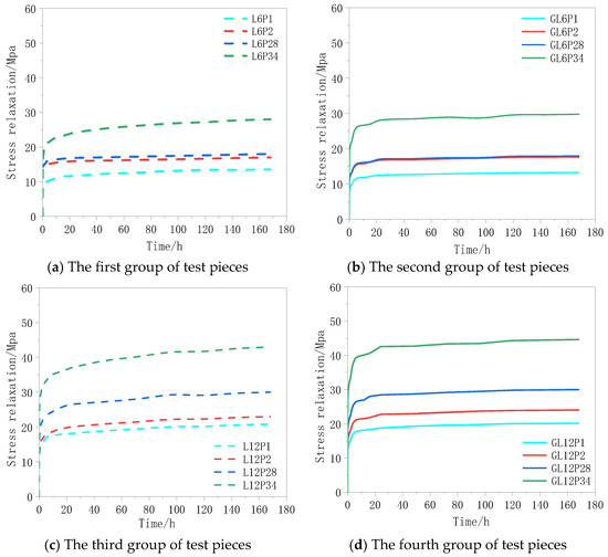 To ensure the reliability of the test results, we pre-made four sets of L12P2 specimens and performed a 168 h relaxation test. The results demonstrate that the relaxation loss rate of the four sets of L12P2 specimens was almost the same (see Figure 3).