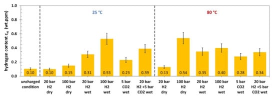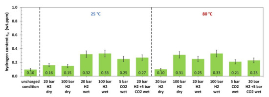 Like for the L80, the hydrogen content of 42CrMo4 (Figure 5) in the uncharged condition was 0.10 wt. ppm. At 25 °C, dry H2 gas with a pressure of 20 and 100 bar did not cause any significant hydrogen absorption. The same was true for 20 bar dry H2 gas at 80 °C, whereas 100 bar resulted in a total hydrogen content of 0.54 wt. ppm. Wet conditions with H2 gas promoted hydrogen absorption at 25 and 80 °C. The hydrogen content measured after autoclave tests on 42CrMo4 with CO2 gas was comparable to the results obtained for the L80 under the same conditions. The gas mixture also clearly caused an increase in hydrogen absorption. The results for P110 are shown in Figure 6.