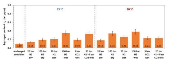 At 80 °C, the investigated materials tend to absorb more hydrogen, when exposed to dry H2 gas than at 25 °C. This observation is in line with Sieverts’ law, according to which the hydrogen solubility in metals increases with temperature. Under wet conditions, additional factors may influence the temperature dependence of the amount of hydrogen absorbed. The solubility of gases in brine generally decreases with temperature while chemical reaction rates (e.g., in the event of corrosion) double with each 10 °C. The temperature dependence of the hydrogen uptake under conditions with CO2 gas may be influenced by a change in morphology of the corrosion product film. Above 65 °C a more protective corrosion product layer is formed [62]. Overall, the results show no significant temperature influence on the hydrogen absorption of the carbon steels that were tested in autoclaves under wet conditions.