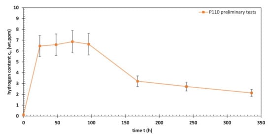 Hydrogen content of P110 after various times of ambient pressure testing in an acidified H2S-saturated aqueous brine solution with 5.0 wt.% NaCl and 0.5 wt.% CH3COOH at room temperature (NACE Solution A).