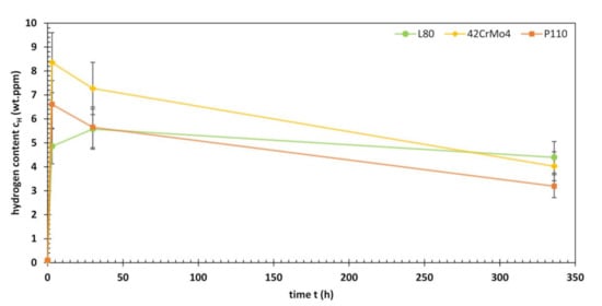 Hydrogen content of L80, 42CrMo4 and P110 after 3, 30 and 336 h of ambient pressure testing in an acidified H2S-saturated aqueous brine solution with 5.0 wt.% NaCl and 0.5 wt.% CH3COOH at room temperature (NACE Solution A).