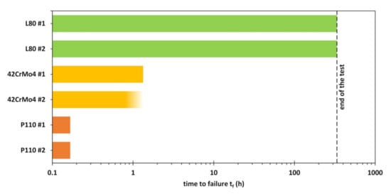 The first specimens to fail in H2S were those made of P110. These were broken after only ten minutes of immersion. They were followed by the 42CrMo4, failing after slightly less than 80 min and after 80 min respectively. None of the specimens made of L80 failed in NACE Solution A during the 336 h of testing.