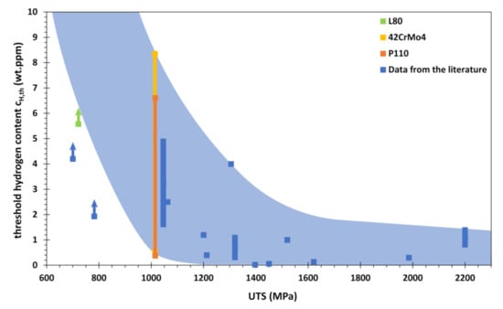 Since the specimens made from L80 did not fail under a constant load of 90% of the SMYS, although a maximum hydrogen content of 5.58 wt. ppm was found, the threshold concentration for hydrogen embrittlement is greater than this value. This is in accordance with the findings from the literature, where a critical hydrogen content of 22.8 wt. ppm was proposed [20]. In the present work, the maximum hydrogen content measured after immersion in up 100 bar H2 gas was 0.33 wt. ppm and thus significantly lower. The sour service steel grade L80 is therefore suitable for application under the tested conditions with up to 100 bar H2 gas. The critical hydrogen contents for embrittlement found in this work are compared with data from the literature in Figure 10.