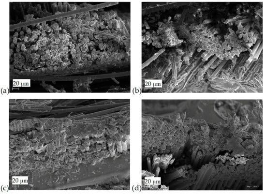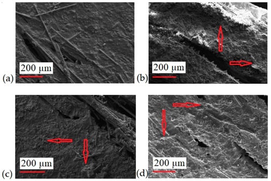 The fracture morphology of composite samples was assessed using the SEM method. For all the tested samples, no significant differences were observed at the epoxy fiber-matrix interface (Figure 1a–d). This may indicate a good combination of all components in this layered composite. The fibers in the composites 5PVC and 10PVC were found to be more closely connected than in the reference sample (Figure 1c,d). Obtaining a favorable composite structure by properly connecting the epoxy matrix with the fiber and filler led to the improvement of the mechanical properties of the materials [29]. Moreover, SEM images of samples after ILSS tests are presented in Figure 2. The resulting pattern of damage in all cases was similar. The single pulled out fibers were not observed, which confirms their good connection with the matrix. Arrows indicate the distribution of PVC particles.
