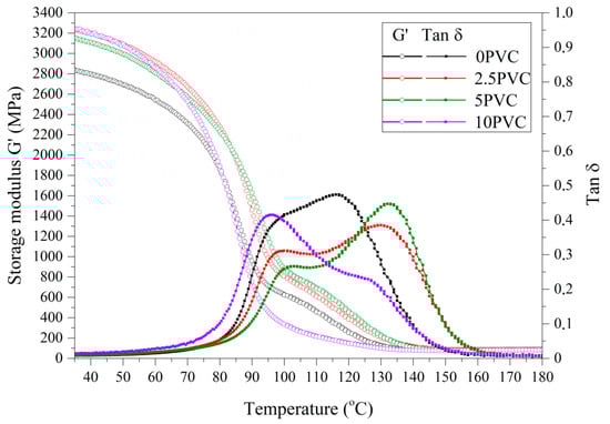 Dynamic thermomechanical analysis (DMTA) was used to assess the thermomechanical properties of the composites using the Anton Paar MCR 301 apparatus (Graz, Austria) in the torsion mode, at a frequency of 1 Hz, in the temperature range of 25 °C–180° C and a heating rate of 2 °C/min. The glass transition temperature (Tg) was determined for the maximum tan δ value.