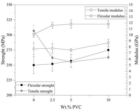 The bending resistance of fiber-reinforced composite materials is important for their functional properties. Flexural strength values for the modified 2.5PVC and 5PVC composites were similar to the unmodified sample (Table 2). Figure 4 shows the dependence of the obtained results of mechanical tests on the content of the PVC additive. However, a significant improvement of this value is observed from 250 MPa to 275 MPa for the composite with the highest content of PVC powder (10 wt.%). The values of the flexural modulus were similar for all the modified materials and slightly higher than for the reference sample. The addition of PVC powder may improve the rigidity of the tested materials and make it possible to obtain a composite with specific functionality [21].
