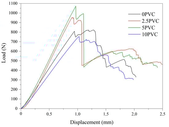 Interlaminar Shear Strength is the possibility to resist the inter-laminar deformation under load [33]. This is especially important in the case of composites reinforced with fibers and modified with other particles. The composites ILSS as well as the maximum load values determined, and the maximum load are summarized in the Table 4. The ILSS values for the modified composites were higher than those of the reference sample, which may indicate the beneficial effect of the PVC addition, and is in good agreement with the results obtained in the flexural test. This confirms the good strength of the interfacial bond between all composite components. In the work of Scalici et al. [13] the ILSS value for eight-layer basalt–epoxy composites was 18.9 MPa for composites produced by resin infusion and 21.1 MPa for composites produced by vacuum bagging. Therefore, it can be concluded that the results obtained for the tested PVC composites are satisfactory. Moreover, according to the literature, the Cl atom of PVC can attack the oxirane ring and chemically bond to the epoxy matrix [31]. Additionally, the recorded maximum force for all PVC composites was higher than for the neat sample. The highest values ILSS and p were recorded for the 5PVC sample. In the case of 10PVC these values were lower, which may be due to the tendency of a large amount of PVC particles to agglomerate. Figure 5 presents the dependence of load on displacement for investigated materials. The curves of all samples are characterized by the first linear region, followed by a sudden decrease and increase in load.