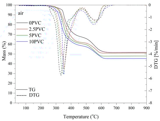 The thermogravimetric method was used to evaluate the thermal stability of the composites. The results are summarized in Table 5. The introduction of PVC powder reduced the T10% value of composites, caused by a partial distribution of PVC grains at a lower temperature than the pure epoxy resin. The residue mass after the test was similar in all cases, and on average reached 50 wt.%. It should be emphasized that the addition of PVC to the epoxy matrix delayed its degradation. This confirms the shift in the maximum decomposition temperature DTG peak towards higher temperatures for composite samples compared to the reference sample. The characteristic thermogravimetric curves are shown in Figure 6. A two-stage distribution was observed for all the tested composites.