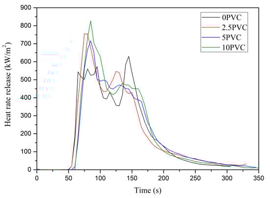 The HRR curves of composites are shown in Figure 7. All the investigated materials exhibited curves consisting of two maxima, the first peaks were a result of the rapid initial increase in HRR, while the second appeared at the end of burning. Contrary to composites without PVC, higher values were obtained for the first peak, and the second peak flattened as the proportion of the additive increased. The average values of HRR were similar to those obtained for the reference material, and a slight decrease was noted for composites with the highest amount of PVC only (Table 6). The congruous reduction in av-HRR values (by approx. 10%) for epoxy composites containing 10 wt.% of PVC powder was observed in our previous work [28]. PVC has self-extinguishing properties and does not self-ignite [35]. Howeever, the introduction of only high content of powdered PVC into the epoxy resin has a positive effect on the fire resistance of composites, such as a reduction in heat release rate. In our previous article, a reduction in HRR and increase in TTI was achieved with 40 wt.% of PVC additive [28].