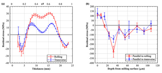 Note that the initial bulk stress within the two sheets was assumed to be negligible due to its low magnitude. Preliminary testing revealed that the bulk residual stress in the pre-stretched AA7055-T7751 was in the range of −25~30 MPa (Figure 1a), similar to that of AA7050-T7451 [22] but with a magnitude that is about 10 MPa greater. After the extraction and milling processes, the material removal resulted in the relaxation of residual stress, and thus the two plate samples inherited a relatively low initial stress condition (<30 MPa).