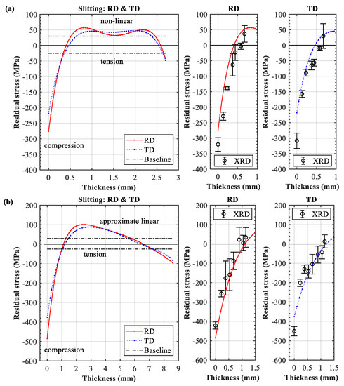 Figure 2a,b shows the through-thickness distribution of the residual stress in the 3- and 9-mm LPF sheets, respectively. Note that the range of bulk residual stress in the base plate is also plotted for comparison (−25/+30 MPa baseline). The slitting results clearly indicate that both sheets exhibited an approximately equal biaxial stress state. The through-thickness distributions of the RD and TD residual stresses were similar; that is, the tension in the center was balanced by the compression on both the treated and untreated sides. The residual stress across the entire section satisfied the overall equilibrium. It can also be seen that surface stresses transferred from tension (Figure 1a) to compression. The XRD and slitting results were in good agreement for the near-surface region, which validated the observation that the in-plane stress components in RD and TD were roughly of the same magnitude.
