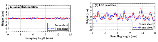 Surface roughness of the two LPF sheets: (a) as-milled condition and (b) laser-peened condition.