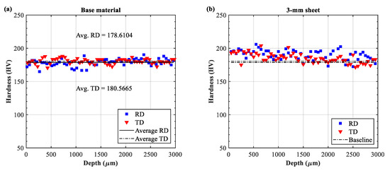 The cross-sectional hardnesses of the untreated material, the 3-mm, and the 9-mm LPF sheets are shown in the Figure 4. Prior to LSP treatment, the base material demonstrated a relatively good consistency in both directions, with an average hardness of 178.6104 HV and 180.5665 HV in the RD and TD, respectively (Figure 4a). After laser peening, a slight increase was observed at the peening-affected depth (1~1500 μm) in both 3- and 9-mm sheets. The hardness approximately increased by 5.56~7.78% (average 190~194 HV) as compared with the untreated condition in Figure 4a. These observations are consistent with the minor enhancement in hardness often observed in aluminum samples under single impact [13,14]. Additionally, no significant difference in the hardness variation was found between the two sheets. This may imply that the effect of shockwaves on the hardness enhancement was similar in the 3- and 9-mm sheets.