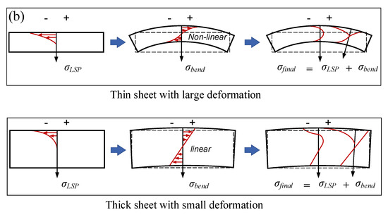 Essentially, the final state of the residual stress (σfinal) in the LPF sheet is a superposition of the peening-induced elastoplastic stress (σLSP) to the affected depth and the elastic bending stress (σbend) across the thickness (Figure 8b). It should be noted that compressive stress on the peened side must inevitably be compensated by cross-sectional bending stress due to stress equilibrium and deformation compatibility. Consequently, the thick sheet inherited small deformation and low bending stress, resulting in lower compensation for compressive stress on the peened side. The thick section could provide adequate constraints to maintain a deep depth and high magnitude of compressive stress on the peened side. In contrast, the thin sheet inherited large deformation and high bending stress, resulting in compressive stress being compensated to a greater extent on the peened side. The thin sheet lacked enough constraints, resulting in an increased tensile region to balance the high compression on the treated surface (i.e., a decrease in the compressive stress depth).