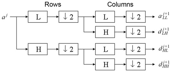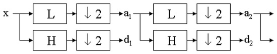 However, the above texture characteristics based on the run-length matrix and co-occurrence matrix detect quite small parts of the mucous membrane image. To evaluate objects visualized more globally, discrete wavelet transform is used [23,24,25]. To compute the wavelet features in the first step, the Harr wavelet is calculated for the whole image. The discrete wavelet transform (DWT) is a linear transformation that operates on a data vector whose length is an integer power of two, transforming it into a numerically different vector of the same length. It is a tool that separates data into different frequency components and then studies each component with resolution matched to its scale (scale 5 indicates bigger texture elements than scale 3). The discrete wavelet transform is computed with a cascade of filters followed by a factor 2 subsampling (Figure 3).