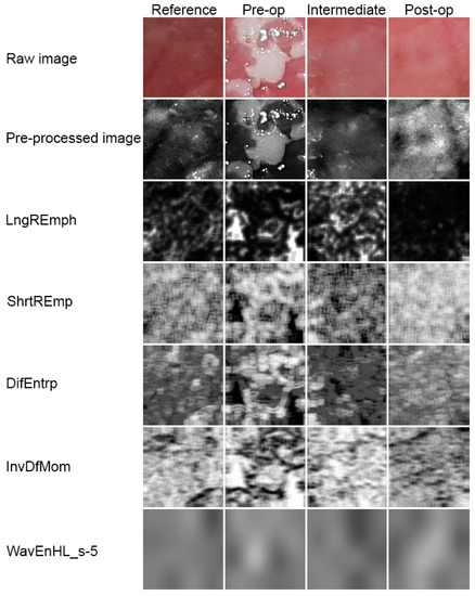 All of the features described above indicate a pathological image presented by leukoplakia and complete reconstruction of the correct mucosal image after laser ablation. This applies to the microscale, but if one considers the macroscale, new information is provided by the assessment of the discrete wavelet transformation feature (Figure 8). There is a progressive increase in the energy of the HL subband in the direction of the reference images by leukoplakia (pre-operational), from the intermediate period up to post-operational (p < 0.001). This is related to the creation of extensive oval structures filling up most of the image samples. This feature detects much larger structures than features derived from the run-length matrix and co-occurrence matrix (Table 1).