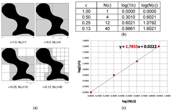 Graphical interpretation of the counting box method for fractal dimension measurement. (a)—grids needed to cover the studied shape at the sequential stages, (b)—values of log(1/ε) and log(N(ε)) in function of N and ε, where: ε—length of box that creates a mesh covering surface with the examining pattern; N(ε)—minimal number of boxes required to cover the examining pattern, (c)—interpretation of the fractal dimension as calculating the value of the directional factor of straight line.