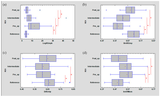 The analysed image texture features derived from the run-length matrix ((a) LngREmph, (b) ShrtREmp) and co-occurrence matrix ((c) DifEntrp, (d) InvDfMom). The values of all features presented here are returned after treatment to the value characteristic for the reference mucosal image. + average, blue vertical line indicates median, * significant difference (p < 0.05).