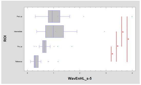 Recognition of large structures in the field of vision (discrete wavelet transform) revealed in the image of the buccal mucosa after surgery, representing a difference from the reference image. These differences consist of the presence of oval fields with a different structure than normal mucous membrane. + average, blue vertical line indicates median, * significant difference (p < 0.05).