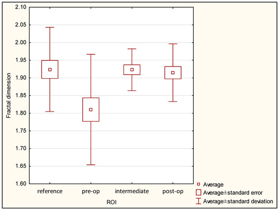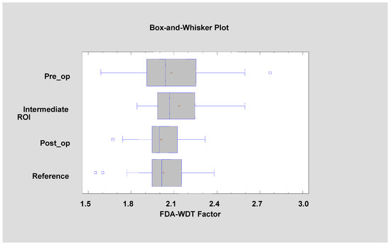 The lowest value of FDA was observed in the pre-operational group (1.810 ± 0.156), and the highest value was seen in the reference group (1.924 ± 0.119). FDA at a level of 1.923 ± 0.059 was noted in the intermediate period group, and FDA value 1.915 ± 0.082 was observed in the post-operational group. It is important that significant differences were seen in the case of the pre-operational group versus the reference group (p < 0.05), but no significant differences were seen between the reference, intermediate period, and post-operational groups. The statistical chart is shown in Figure 9, and the results of Kruskal–Wallis one-way analysis of variance are shown in Table 2.