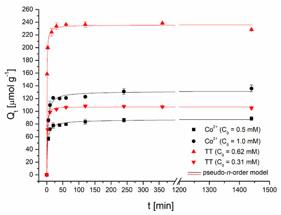 gradually rose, with the increasing initial concentrations of Co2+ and TT in the adsorption system indicating faster removal at higher Co2+ and TT concentrations. Moreover, the fractional numbers n were close to 2, implying that the determining step of the biosorption of both Co2+ and TT by magnetically responsive biomass is chemical adsorption. Similarly, the order of adsorption for rhodamine B and methyl orange removal by Fe3O4 nanoparticles-functionalized activated carbon obtained from the pseudo-n-order model varied from 1 to 2 and was closer to 2 [8]. On the contrary, Fraga et al. [27] observed the great value of n (7.46) for the adsorption of reactive drimaren red by amino-Fe3O4 functionalized multilayer graphene oxide, suggesting a highly heterogeneous interface.