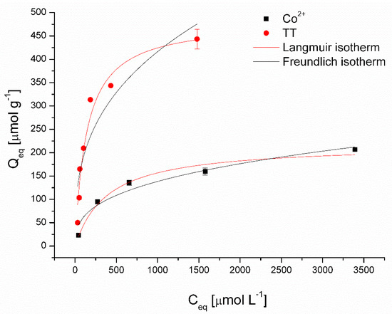 Figure 6 presents the nonlinear fitting results of the Langmuir and Freundlich models, and Table 2 summarizes the calculated isotherm parameters for the removal of Co2+ and TT using magnetically responsive biomass as the adsorbent. The higher coefficients of determination (R2) of the Langmuir model for both Co (0.980) and TT (0.961) removal suggested that the adsorption behavior could be attributed to the monolayer chemical adsorption mechanisms [28]. Moreover, reflecting values of affinity constant b, the magnetic biosorbent exhibited considerably higher affinity for TT (0.0072 L μmol−1) compared to Co2+ ions (0.0025 L μmol−1). The maximum adsorption capacity Qmax at 22 °C was 483 µmol g−1 for TT and 218 µmol g−1 for Co2+ ions, respectively. It should be highlighted that the Qmax value of the magnetic biosorbent for Co2+ ions is slightly higher than that of the native biomass counterpart, and for TT, it is significantly higher (Table 2). Improved adsorption capacity, especially in the case of TT removal, could be ascribed to biomass modification, which led not only to selective magnetic biosorbent separation but also to a synergistic adsorption effect (see discussion below). Such a synergistic effect in methyl orange and rhodamine B removal after the Fe3O4 functionalization of activated carbon was observed by Liu et al. [8].