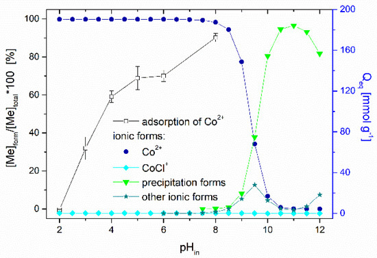 The speciation of cobalt calculated using the MINEQL+ program indicated that Co particularly occurs as a Co2+ (99.7%) cation within pH ranging from 2.0 to 8.0 (Figure 7). Other cobalt ionic forms (Co(OH)44+, Co(OH)3−) are present at a solution pH > 8.0, and Co precipitation begins at pH > 8.0. We suppose that the notably higher removal capacity (172.3 µmol g−1) at the initial pH of 8.0 was related also to the formation of Co(OH)2 precipitates directly on biosorbent surfaces.