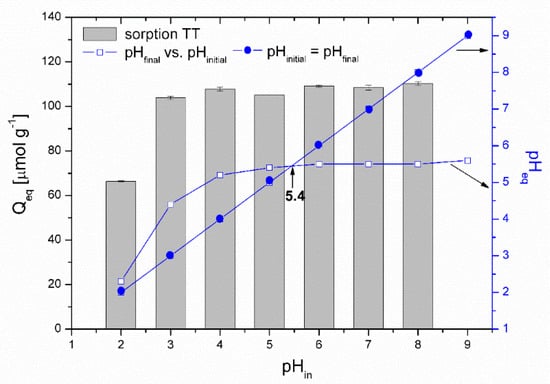 pHpzc determination and the effect of initial pH on the adsorption of TT (313 µmol L−1) by the magnetically responsive biosorbent (2.5 g L−1; T = 22 °C).