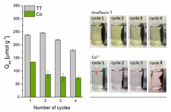 The cyclic experiments (Figure 11) revealed that the TT adsorption capacity decreased slightly from 238.6 to 213.2 µmol g−1 after the third cycle and to 179.6 µmol g−1 after the fourth cycle, indicating a high adsorption ability and a good reusability of the magnetic biosorbent for TT removal. In contrast, the adsorption capacity of Co2+ on the biosorbent significantly dropped from 134.2 to 86.8 µmol g−1 after the first adsorption–desorption cycle. After the next three cycles, only a slight decrease to 73.4 µmol g−1 was observed. The markedly higher decrease in the adsorption capacity of Co2+ ions on the biosorbent during the adsorption–desorption cycles as compared to TT confirmed the different adsorption behavior. In addition, four adsorption–desorption cycles practically did not affect the magnetic separation of biosorbent (Figure 11), confirming the very good stability of microwave synthesized nanoparticles and microparticles of iron oxides impregnated on the biomass surface also in an acidic environment (0.1 M HCl and 0.1 M CH3COOH), which is in agreement with the study of Wang et al. [43]. Moreover, as was pointed out by Philben et al. [44], the physical and chemical structure of moss cell walls cause their high persistence in the environment, and this could also contribute to their notable biocomposite stability.