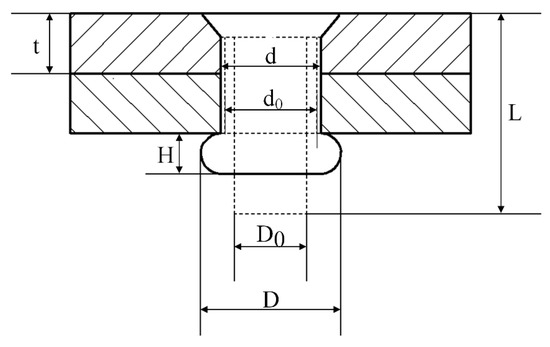 where is the length of the rivet shank, and are the thickness of the upper and lower plates, respectively, is the height of rivet head, is the driven head diameter, is the rivet diameter, is the hole diameter.