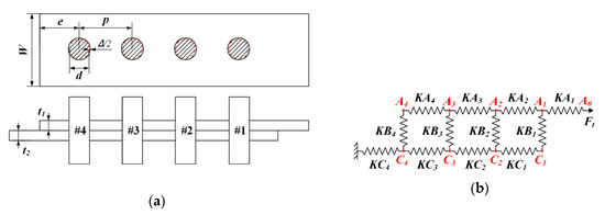 Spring-mass model of the riveted lap joint with four rivets: (a) Simplified model, where represents the plate width, represents the rivet margin, represents the rivet pitch, is the rivet diameter, represents the interference, and represent the thicknesses of the upper and lower plates, respectively; (b) spring-mass model, where represents the spring stiffness of the upper plate, represents the spring stiffness of rivet and represents the spring stiffness of the lower plate.