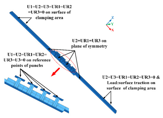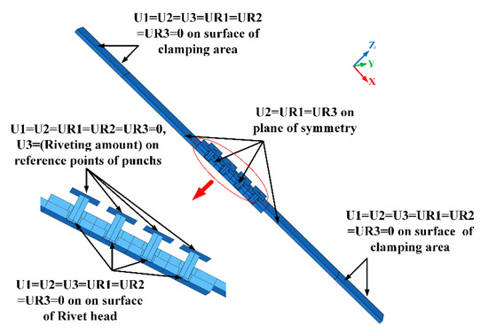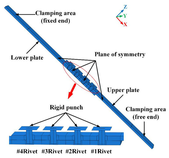 The boundary conditions in riveting and tensile steps are shown in Figure 8 and Figure 9, respectively. In riveting steps, all degrees of freedom for rivet heads are constrained. The X-direction, Y-direction, and Z-direction are constrained on the clamping areas of the upper and lower plates. The degree of freedom in Z-direction of punches is free so the riveting displacement load can be applied. In the tensile step, all degrees of freedom of punches and the clamping area on the lower plate are constrained. The degree of freedom in X-direction of the clamping area on the upper plate is free for tensile load application. In both riveting steps and tensile step, the translational freedom in Y-direction and rotational freedoms in X and Z-directions are constrained on the symmetry plane.