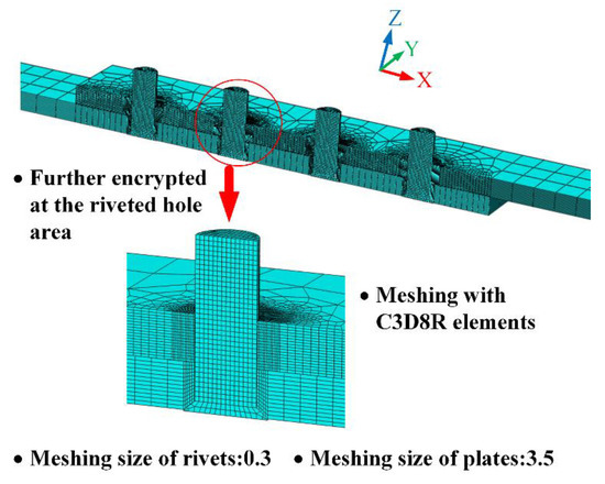 The meshed model is illustrated in Figure 7. The hexahedral elements of reduced integration eight-node solid continuum elements C3D8R are used for meshing, which can avoid the shear locking problem under large deformation. The meshing size is 0.3 for rivets and 3.5 for plates. Moreover, the meshing of the riveted hole area is further encrypted to obtain a more precise result. Take group 4_4_4_4_16 as an example, the total mesh elements for the riveted lap joint model is 120167.