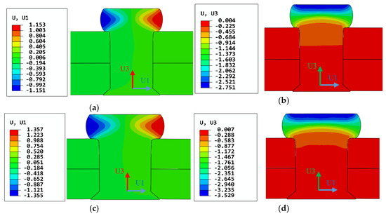 Figure 10 shows the axial and radial deformations of rivets with 4 mm and 5 mm diameters. The simulation results of driven head diameters and heights are shown in Table 3. The results indicate that all the driven head dimensions are meeting the riveting technical requirements.