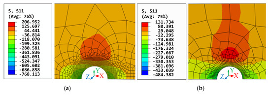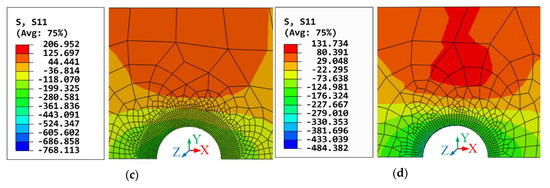 The residual stress distribution around the riveted hole has a great influence on the fatigue performance of riveted joints. The residual stresses on the contact surfaces of the plates (lower surface of the upper plate and the upper surface of the lower plate) are shown in Figure 12. It can be seen that the high-stress area of 5 mm diameter rivet is much larger than 4 mm diameter rivet.