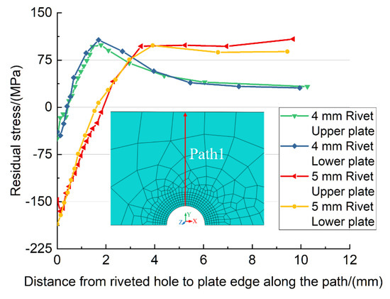 Furthermore, the residual stresses along the path from riveted hole to plate edge are illustrated in Figure 13. As can be seen, the residual stresses of the upper and lower plates are in good agreement at the same riveted hole. At the riveted hole area, the residual stress is compressive, then it becomes tensile as the distance from the hole wall increases. Both the maximum compressive residual stresses of 4 mm and 5 mm diameter rivets appear at the hole wall, and the value of 4 mm rivet is 3.74 times the value of 5 mm rivet. The compressive-tensile stress state transition point of the 4 mm diameter rivet occurs at 0.42 mm from the hole wall, while the transition point of the 5 mm rivet is 1.65 mm. In other words, the larger the diameter of rivet, the greater the range of compressive stress is. Moreover, the tensile residual stress of 5 mm rivet is smaller than 4 mm rivet near the riveted hole. The downward trend of 5 mm rivet is smoother than the 4 mm rivet. Although the final compressive stress of 5 mm is larger than the 4 mm rivet, it is out of the sensitive areas of stress concentration. So, it can be concluded that the use of 5 mm diameter rivet can produce a larger and broader compressive residual stress field than the 4 mm diameter rivet, which is more conducive to improving the fatigue performance of riveted lap joints.