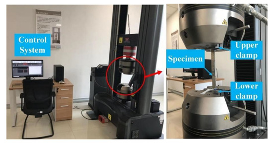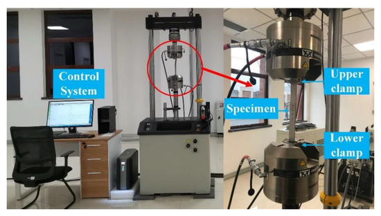 The fatigue tests were conducted with an INSTRON 8801 fatigue testing machine (Instron Corporation, Boston, MA, USA) as shown in Figure 17. The clamping is consistent with the tensile test. The constant amplitude load was set to which was obtained from the static tensile test. The frequency of the fatigue tests was 10 Hz and the stress ratio was set to 0.1. Each group has three specimens, so a total of 30 specimens were tested. The fatigue lives and crack sites of all riveted joints specimens are listed in Table 8.