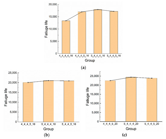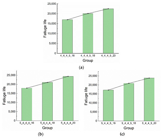 The average fatigue lives of the ten groups of riveted lap joints are illustrated in Figure 19. It can be demonstrated that the fatigue lives of all the other groups are improved compared to the baseline group 4_4_4_4_16. Moreover, group 5_4_4_4_20 has the longest fatigue life, which is consistent with the simulation result. Next, the effects of rivet diameter and pitch on the fatigue life of riveted lap joints are analyzed, respectively.