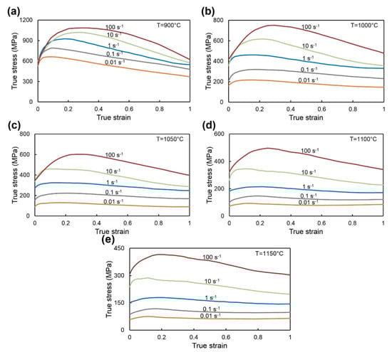 The stress-strain curves of Waspaloy obtained from isothermal hot compression test at different temperatures and strain rates are presented in Figure 2. As expected, the flow stress increases with decreasing deformation temperature and with increasing strain rates. All flow stress curves are characterized by an initial increase in the flow stress until a peak value due to work hardening during deformation. The work-hardening values increased with increasing strain rate or with a decrease in deformation temperature and are directly related to the increase in the dislocation density [32]. The softening behavior of the material can be related to the DRV (dynamic recovery) or dynamic recrystallization (DRX) mechanisms. After reaching peak values at deformation temperatures of 900 and 1000 °C at all strain rates (Figure 2a,b), a constant decrease in flow stress is observed. To a lesser extent, this behavior of the material is observed at 1050 °C for strain rates greater than or equal to 0.1 s−1 (Figure 2c) and for the temperatures of 1100, 1150 °C and at high strain rates greater than or equal to 10 s−1 (Figure 2d,e). It should be noted that these flow stress curves do not have a stable state and in the case of deformation temperatures of 900 and 1000 °C (Figure 2a,b) such behavior may be related to plastic flow instability during deformation. This instability is most often expressed by the occurrence of shear bands, flow localization, or cracking [29].